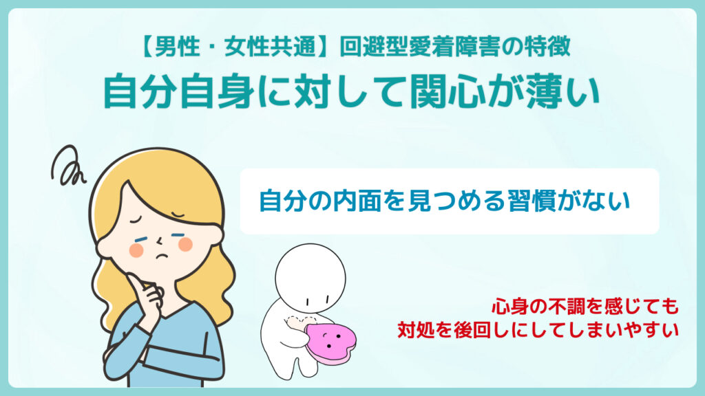 回避型愛着障害の特徴は男女による大きな違いはなく、対人関係や感情の扱い方に共通した傾向が見られます。