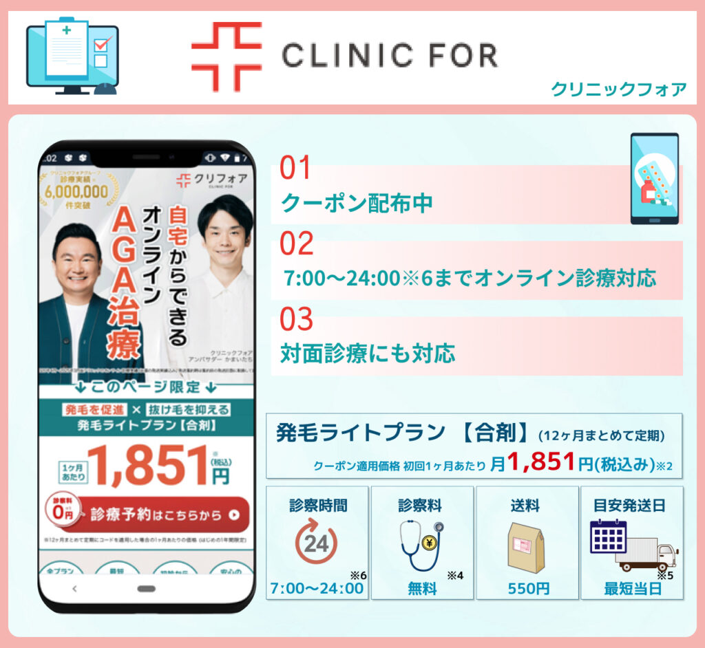※2 発毛プラン:発毛ライトプラン(合剤)の12ヶ月まとめて定期のお薬代が適用となります。別途送料550円+診察料1,650円(※処方されなかった場合)がかかります。※決済ページのクーポン欄に必ず「AGA2024C」と入力してください。