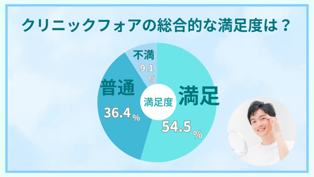 クリニックフォアで治療をした人のうち、半数以上(22名中12名)が総合的に見て「満足」と回答しています。