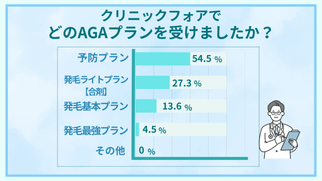 クリニックフォアにてAGA治療を受けたことがある20代~50代以降の男性22名にアンケートを実施しました。