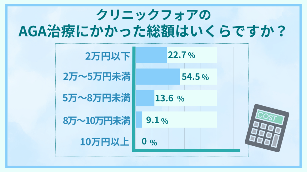 - クリニックフォアのAGA治療にかかった総額はいくらですか?(現在治療中の人は今までかかった総額をお答えください)