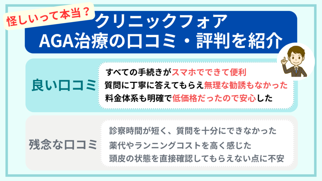 「怪しい」と噂されることもあるクリニックフォアのAGA治療ですが、実際の利用者の評価は賛否が分かれています。