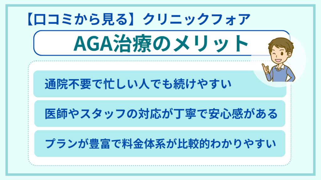 ここでは口コミをもとに、クリニックフォアAGA治療のメリットを3つの視点から整理し、どのような点が支持されているのかを詳しく解説します。