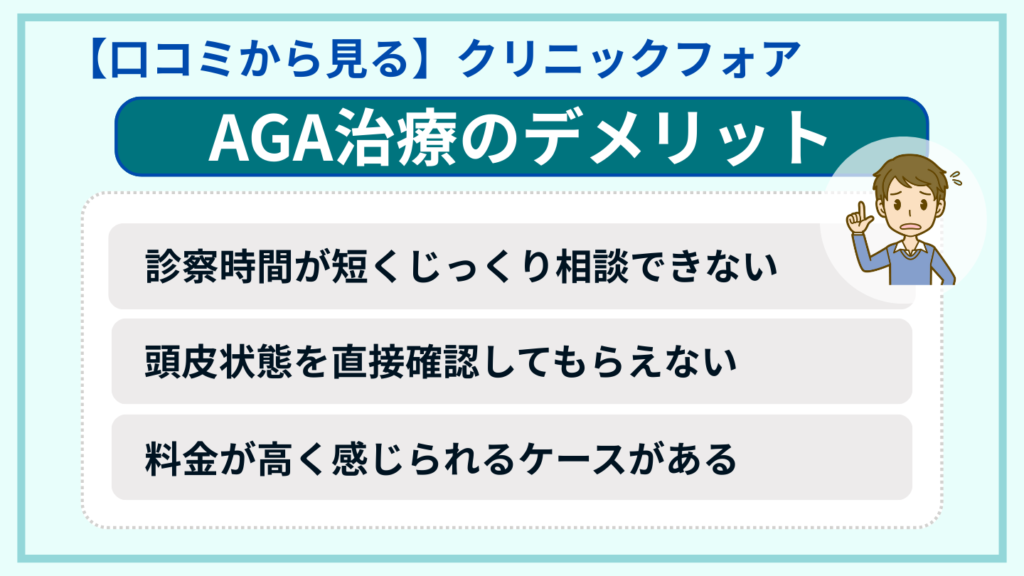 高く評価する人の声が多く寄せられる一方で、クリニックフォアのAGA治療に対して不満を感じている人も存在します。