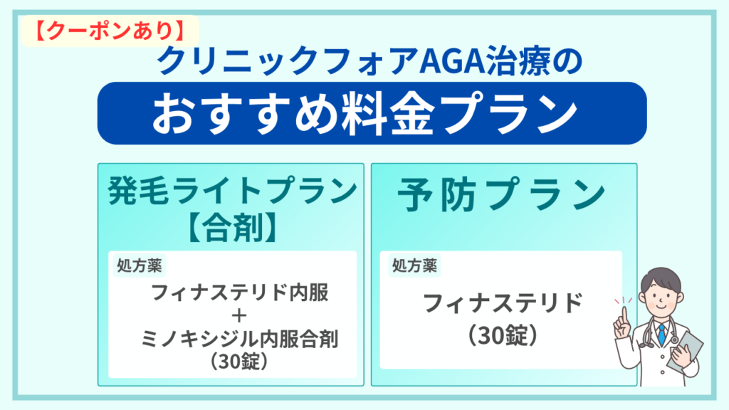 クリニックフォアのAGA治療は、症状や目的に応じて選べる複数の治療プランが用意されている点が特徴です。