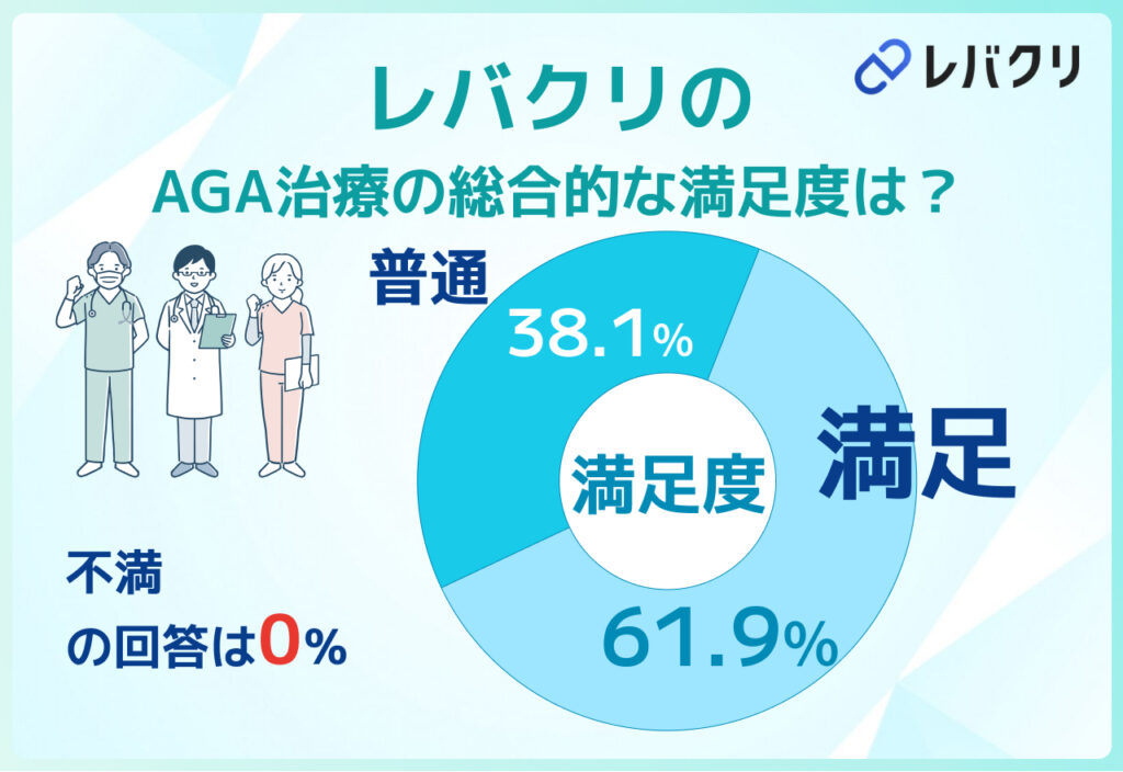 評価のポイントは人それぞれ異なるものの、不満と感じた人が0人という結果から、レバクリのAGA治療は総合的に見て満足度の高いサービスであることがうかがえます。
