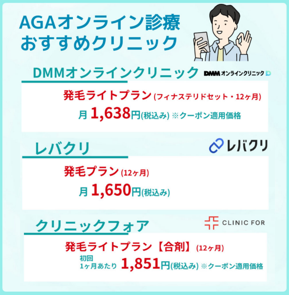 DMMオンラインクリニックのAGA治療料金は、12ヶ月ごとの定期便を軸に複数のプランが用意されています。