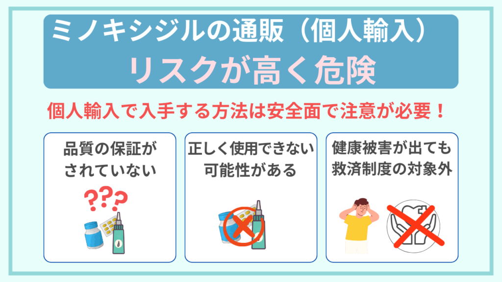 個人輸入で入手したミノキシジルを使用して健康被害が生じた場合、日本の医薬品副作用被害救済制度の対象外となる点にも注意が必要です。