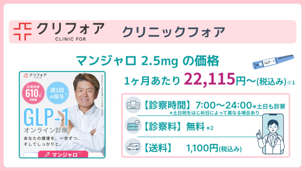 通常は対面型のクリニックですが、マンジャロはオンライン診療を通じて全国どこへでも配送可能と記載されています。