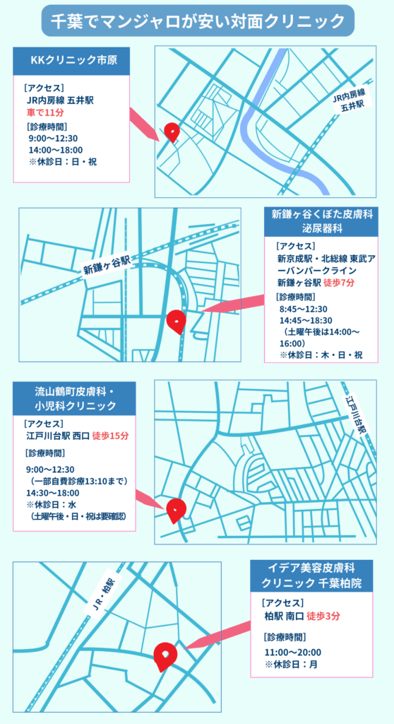 本章では、千葉県から通院可能なマンジャロを安心して処方してもらえる対面診療の医院を厳選して紹介します。