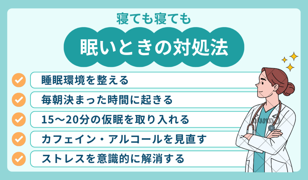 寝ても寝ても眠い場合は、まずは生活習慣など見直せることから意識して取り組んでいくことが大切です。