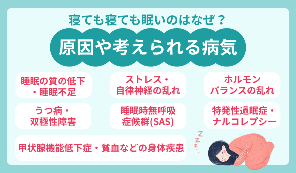 ここでは、寝ても寝ても眠い原因と考えられる主な病気について解説します。