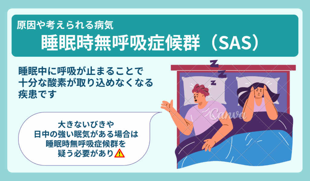 睡眠時無呼吸症候群の可能性があり、必要に応じて睡眠検査が行われます。