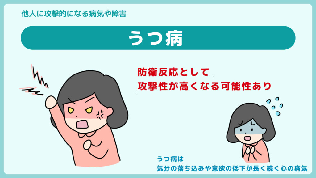うつ病の人は、他人の些細な一言や出来事でも大きな負担になってしまうことがあり、防衛反応として攻撃性が高くなる可能性があります。
