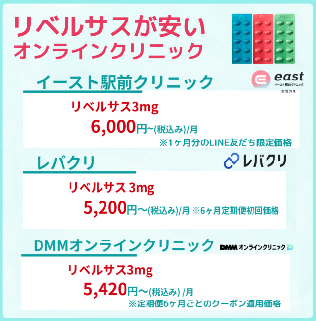 上記の表は、リベルサス3mgを6ヶ月継続した場合のイースト駅前クリニックとレバクリ・DMMオンラインクリニックの総額比較表です。