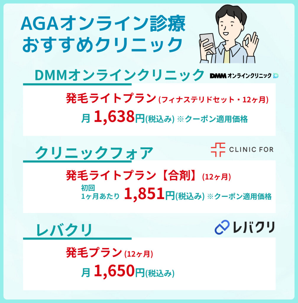 そんな方のために、数あるAGAオンライン診療の中から、費用を抑えて治療できるおすすめクリニック6院を厳選しました。