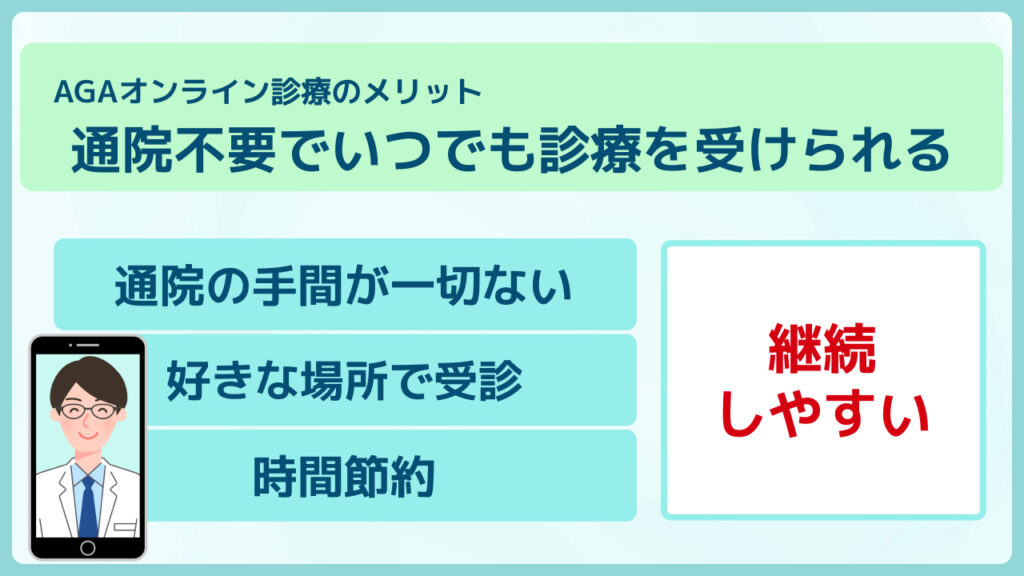 通院せずに治療できるオンライン診療なら、治療を続けやすい環境が整うため、結果的にAGA治療のハードルを大きく下げてくれるでしょう。