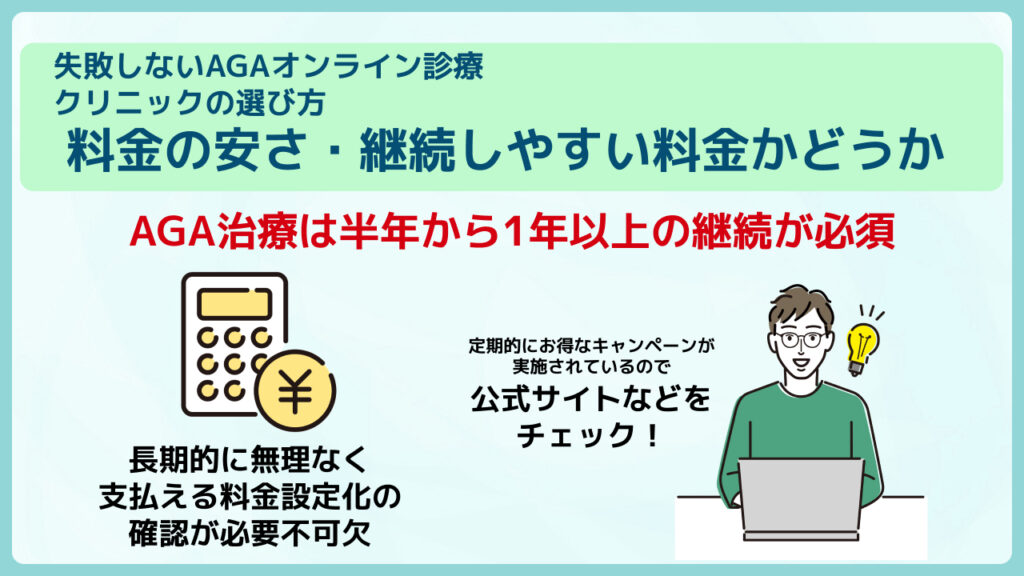 AGA治療は長期的な継続が重要であり、治療費をいかに抑えるかはクリニック選びの重要な要素になります。