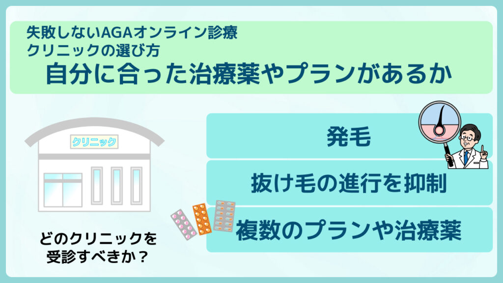 具体的な薬や治療方針がわからない場合は、複数のプランや治療薬を扱っており、症状に応じて医師が最適なプランを提案してくれるクリニックを選ぶと安心です。