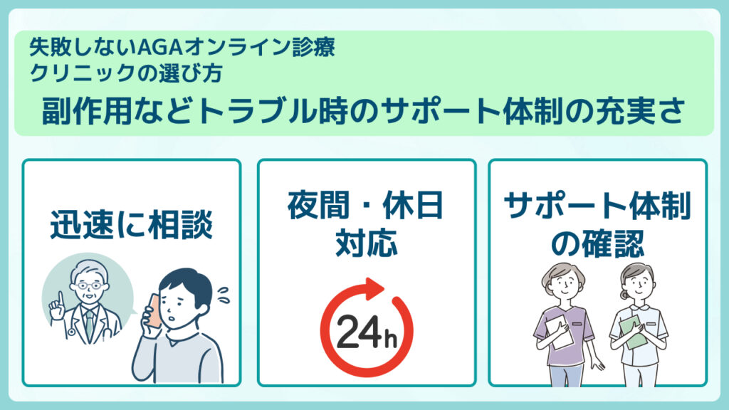 AGA治療薬には副作用のリスクもあるため、万が一の際に迅速に相談・対応できる体制が整っているかは重要な判断基準です。
