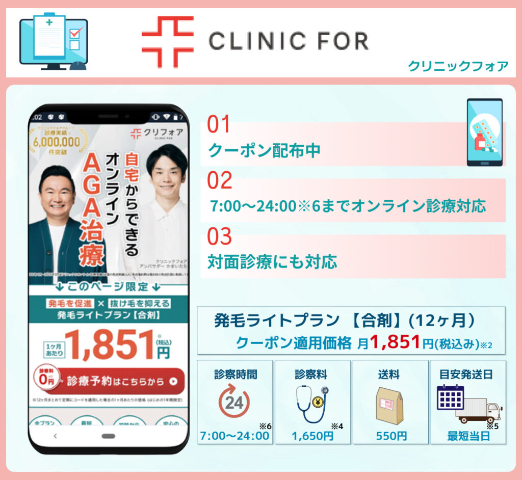 ※2)発毛プラン:発毛ライトプラン(合剤)の12ヶ月まとめて定期のお薬代が適用となります。別途送料550円+診察料1,650円(※処方されなかった場合)がかかります。※決済ページのクーポン欄に必ず「AGA2024C」と入力してください。