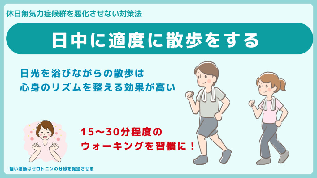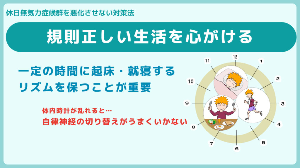 休日でも昼夜逆転を避け、一定の時間に起床・就寝するリズムを保つことが重要です。