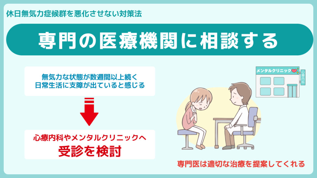 無気力な状態が数週間以上続く場合や、日常生活に支障が出ていると感じた場合は、心療内科やメンタルクリニックへの受診を検討しましょう。