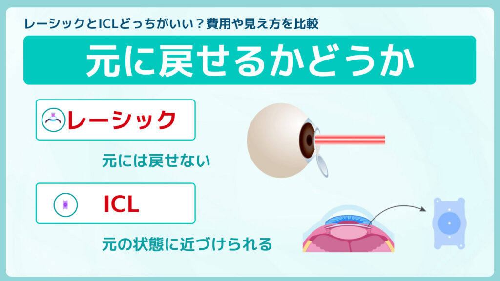 レーシックとICLでは術後元に戻せるかどうかが明確に異なるため、長期的な視点でメリットを理解しておく必要があります。