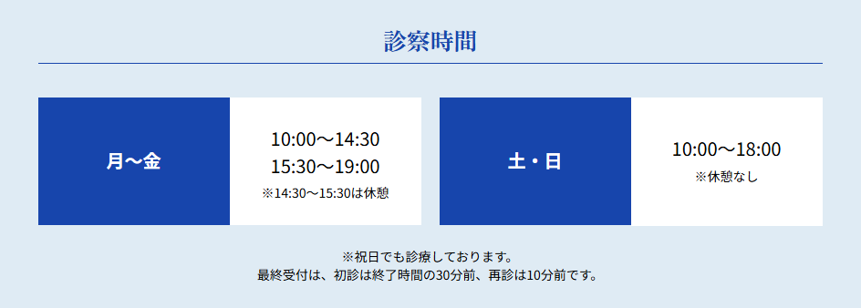 | 診察時間 | 平日 10:00〜14:30/15:30〜19:00 土日祝 10:00〜18:00 ※休診日はクリニックにより異なる |