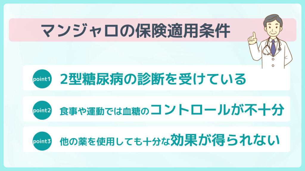 マンジャロが保険適用になる条件は、2型糖尿病の治療に限られます。
